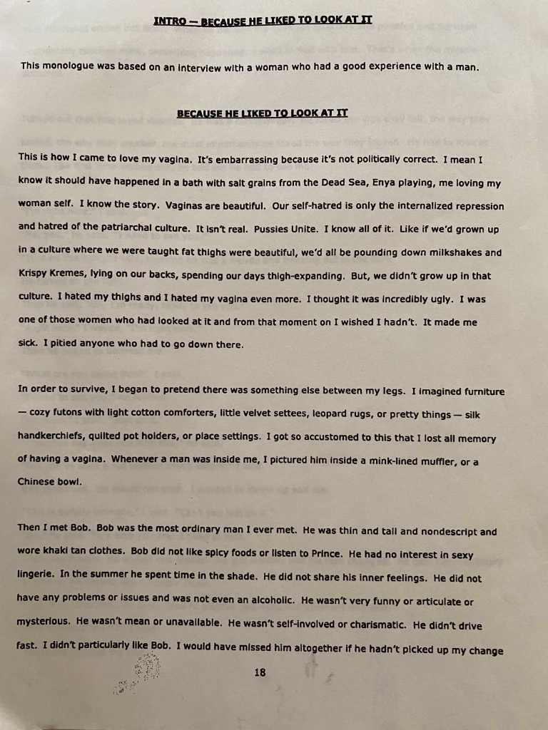 Somewhere in 2001, I became an unofficial line coach for “The Vagina Monologues”.